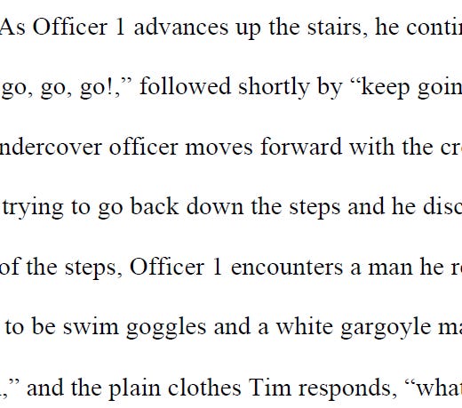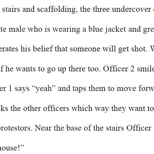 Pope also describes how Officer 1 climbed over a barricade: “Officer 1 began yelling at people in front of him to ‘Go, go, go!’ As they climbed bicycle racks, Officer 1 yelled for the crowd to ‘help him up, help him up!’ followed by ‘push him up, push him up!’”