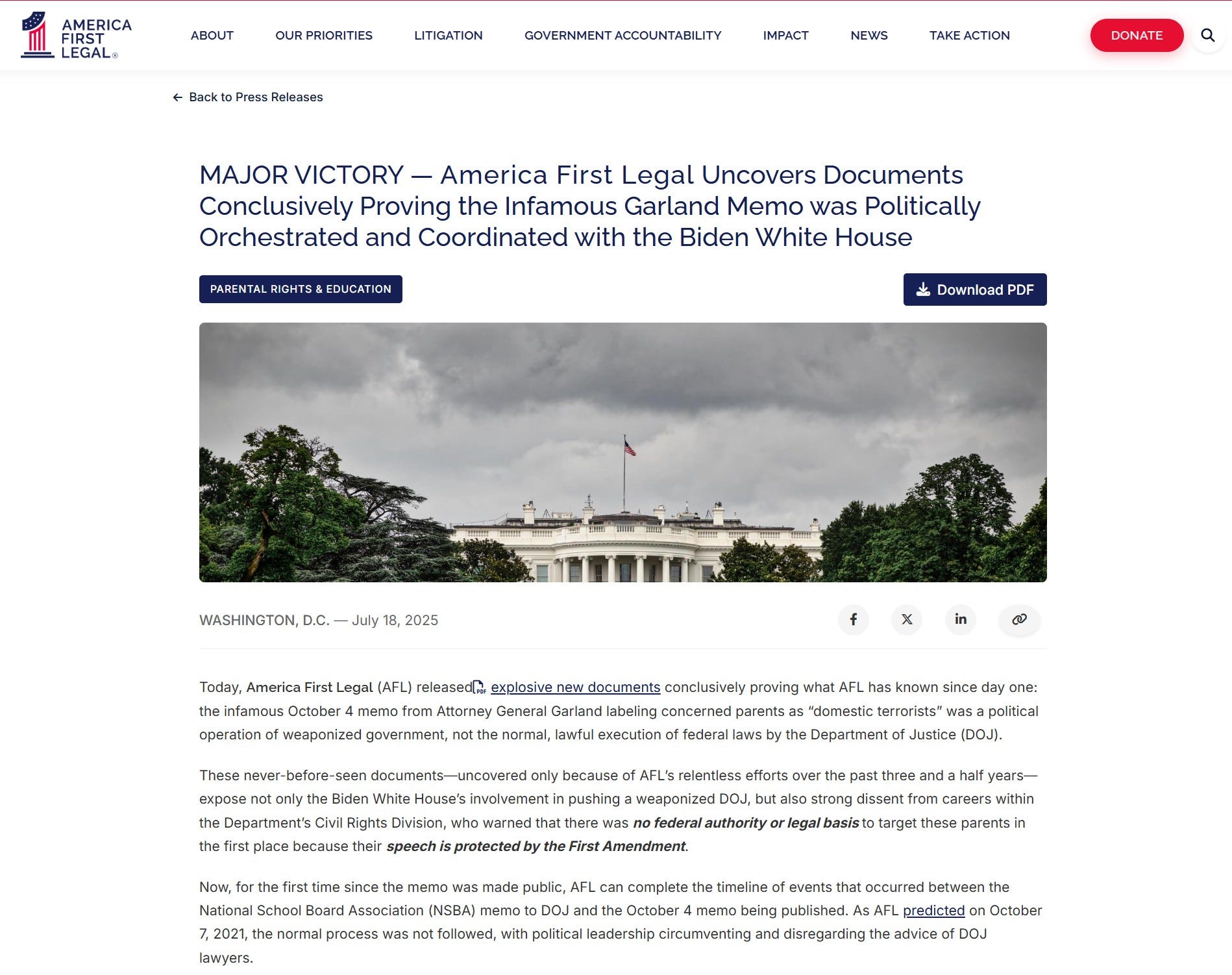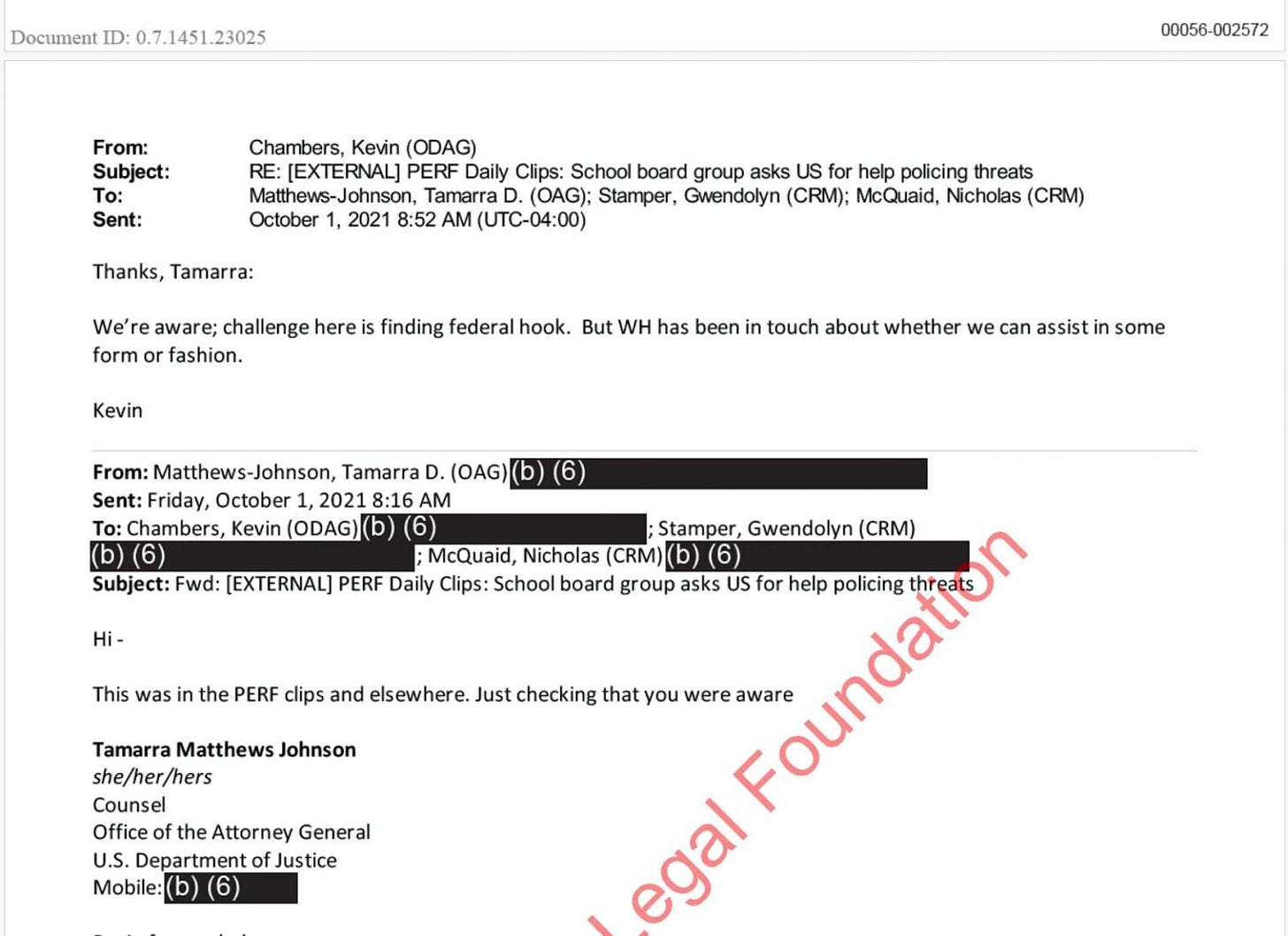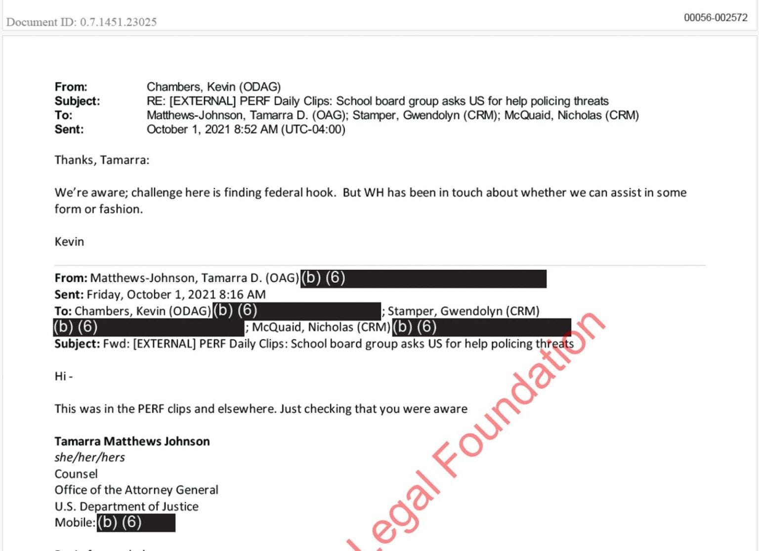 But newly released documents show a rushed, politically driven response coordinated at the highest levels of DOJ—sparked not by legitimate threats, but by a letter from the National School Boards Association (NSBA) accusing parents of terrorism.