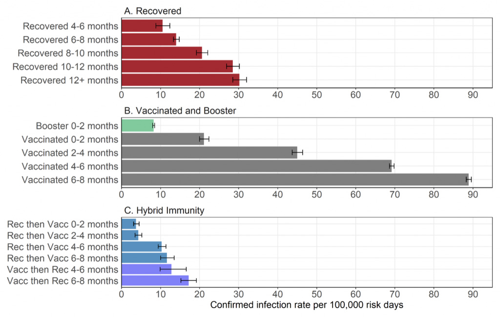 The latest study states that: "Confirmed infection rates increased according to time elapsed since the last immunity-conferring event in all cohorts. For unvaccinated previously infected individuals they increased from 10.5 per 100,000 risk-days for those previously infected 4-6 months ago to 30.2 for those previously infected over a year ago. For individuals receiving a single dose following prior infection they increased from 3.7 per 100,000 person days among those vaccinated in the past two months to 11.6 for those vaccinated over 6 months ago. For vaccinated previously uninfected individuals the rate per 100,000 person days increased from 21.1 for persons vaccinated within the first two months to 88.9 for those vaccinated more than 6 months ago."