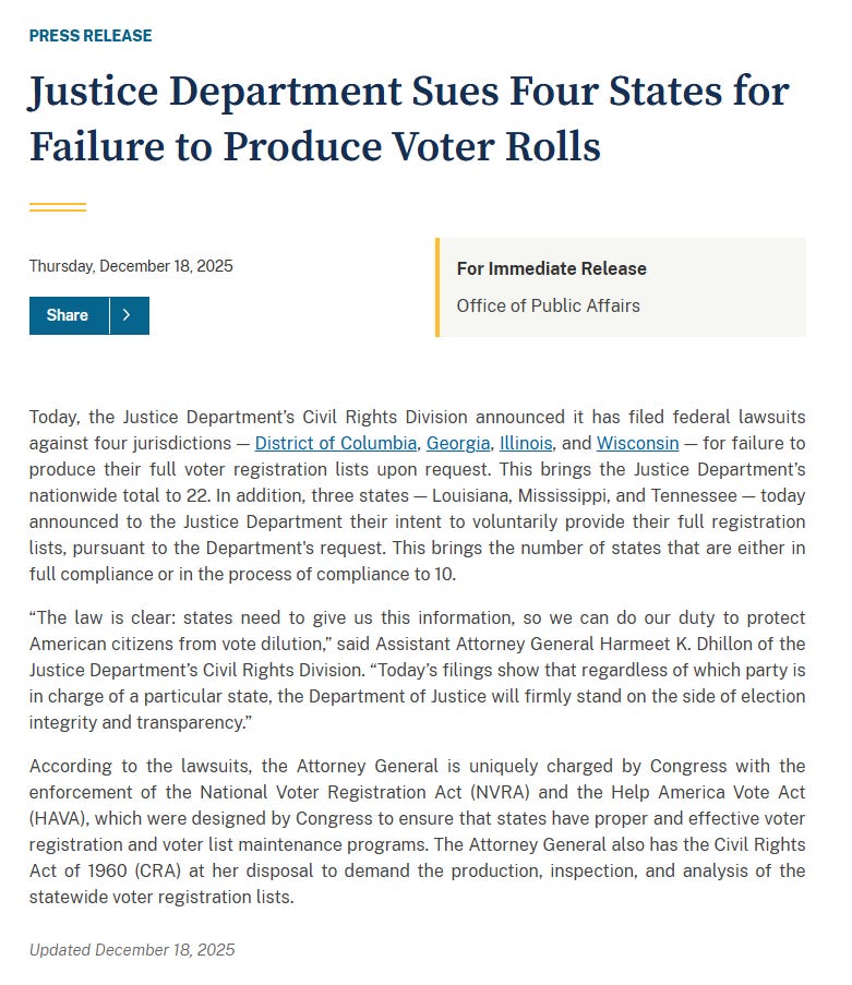 “The law is clear: states need to give us this information, so we can do our duty to protect American citizens from vote dilution,” said Assistant Attorney General Harmeet K. Dhillon of the Justice Department’s Civil Rights Division. “Today’s filings show that regardless of which party is in charge of a particular state, the Department of Justice will firmly stand on the side of election integrity and transparency.”