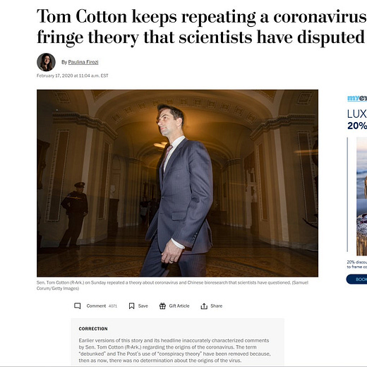 He was slammed by the New York Times and Washington Post in February 2020 for repeating what both outlets referred to as a "fringe theory." It's not so "fringe" now.