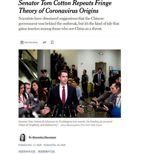 Sen. Tom Cotton (R-AR) has consistently raised the possibility of the Wuhan lab leak and called for investigations about it since early 2020.