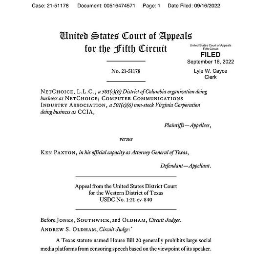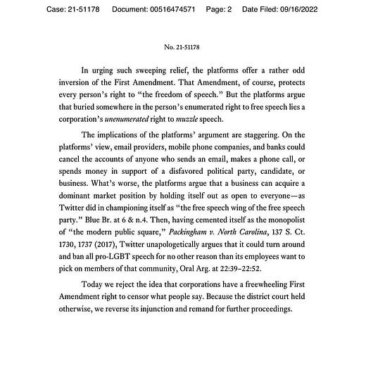 “Today we reject the idea that corporations have a freewheeeling First Amendment right to censor what people say," the court held."Two sections of HB 20 are relevant to this suit. First is Section 7, which addresses viewpoint-based censorship of users’ posts. Section 7 provides":