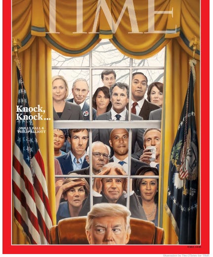 It's none other than Donald Trump's 2020 presidential challengers spying on him while he is in the Oval Office. The cover story headline is "Knock, Knock..."