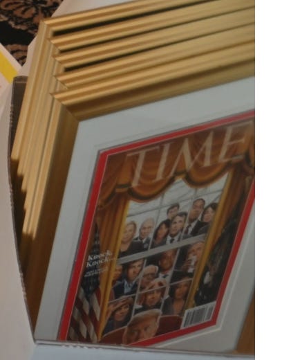 The FBI is showing that they seized property clearly beyond the scope of the warrant, namely framed Time magazine covers.