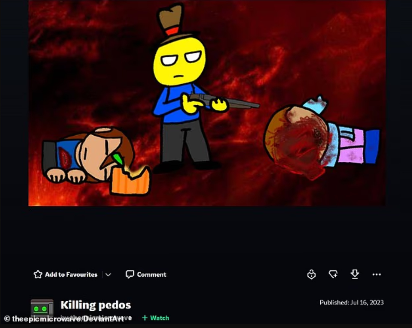 The images recovered from Crooks’ DeviantArt accounts alone dismantle the official narrative. Using the handles “epicmicrowave” and “theepicmicrowave,” Crooks posted disturbing original drawings—characters being shot in the face, executed on the ground, beaten with metal pipes, bleeding from massive head wounds. One image was explicitly titled “k*lling p*dos.”
